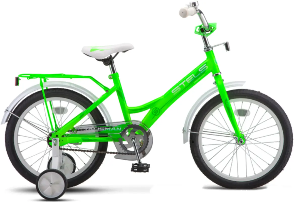 Если вам нужен не дорогой, красивый и надежный байк для ребенка, то рекомендуем приобрести данную модель. Велосипед Stels Talisman 18" модельного года отлично подойдет для начинающих райдеров, так как поможет хорошо освоить двух колесный транспорт. Он достаточно прочный и легкий, благодаря качественной стальной раме. Ее геометрия рассчитана специально для детей с ростом от 105 до 115см, центр тяжести максимально занижен, а посадка практически прямая. Именно так проще держать равновесие на маленькой скорости движения, а чтобы научится этому, в базе стоят фирменные боковые колеса. Торможение осуществляется с помощью классического ножного тормоза, который намного предпочтительнее для детей. Так же порадует наличие таких аксессуаров как крылья и багажник, которые отлично подходят по дизайну.