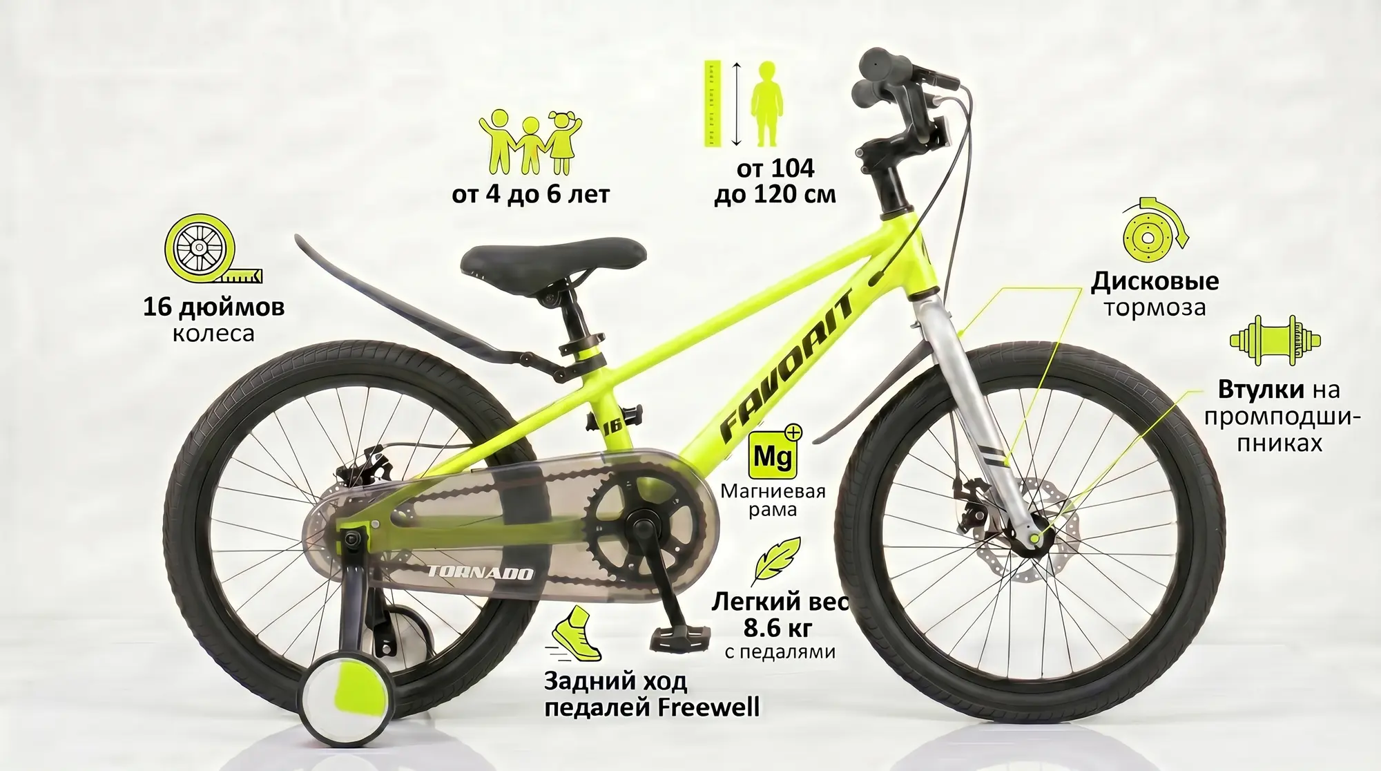 Favorit Tornado 16 — это шаг вперед по сравнению с велосипедами, оснащенными только ножным тормозом. Два дисковых тормоза под руками приучают ребенка к правильной технике с раннего возраста. В паре с магниевой рамой и съемными колесами вы получаете легкий, безопасный и очень современный транспорт для активных прогулок.