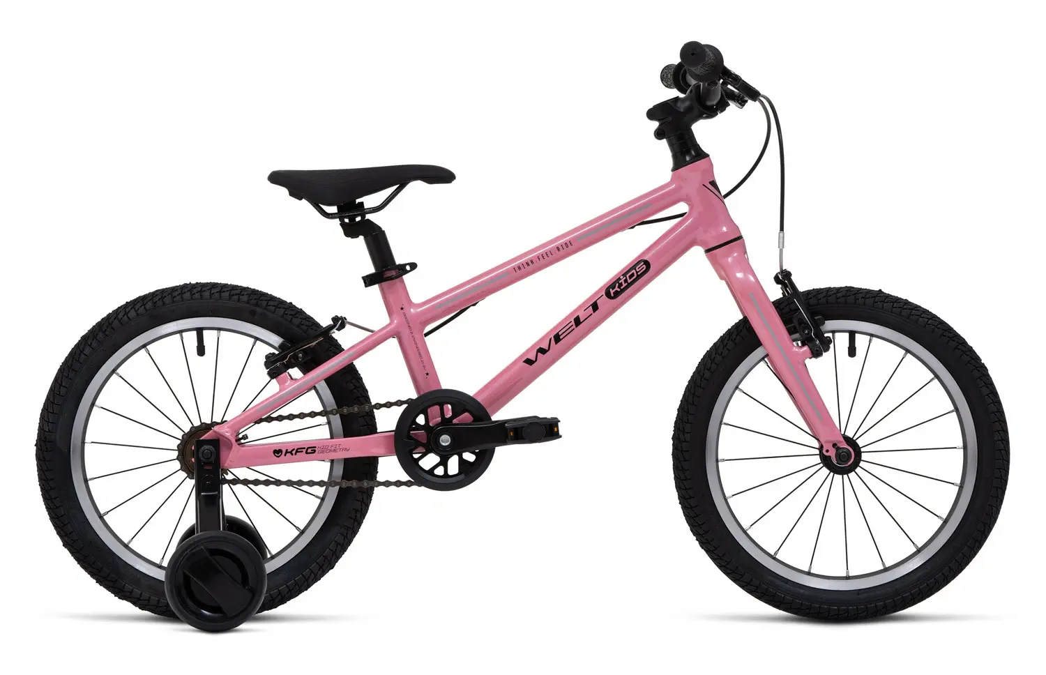 Детский велосипед Welt Teddy 16 представлен в двух цветах: Milky Pink (розовый) и Rocky Beige (бежевый). Он оснащён прочной алюминиевой рамой и подходит для детей, которые только начинают осваивать двухколёсный транспорт. Вот основные характеристики велосипеда: