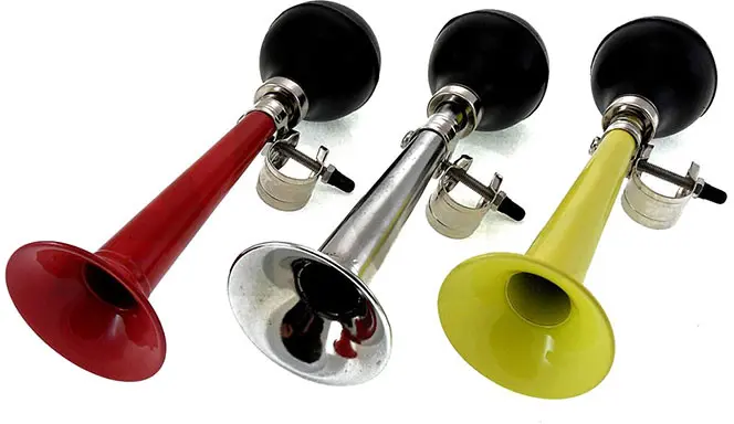 | Сигнал клаксон, прямой. Материал: трубка - сталь, груша - резиновая. Цвет: серебристый. красный, жёлтый. Размер: длина трубки - 230 мм. |
