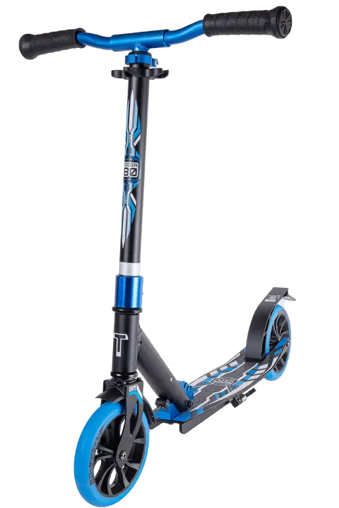 Дека длиной 55 см и шириной 12 см имеет футспейс 31.5 см, достаточный для размещения обеих ступней ребенка. Шкурка на деке, украшенная оригинальным рисунком, предотвратит соскальзывание. Торможение осуществляется алюминиевым тормозом-крылом, на котором дополнительно установлен пластиковый брызговик. Складывающаяся подножка позволит комфортно припарковать самокат на время отдыха.
