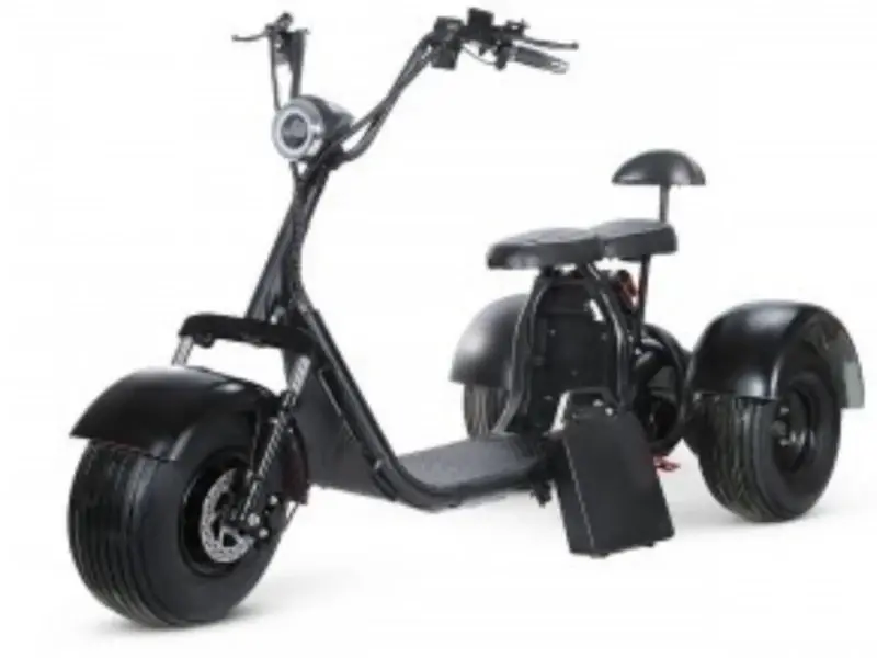- Электрисеский скутер с тремя колесами оснащен дисковыми тормозами, мощной LED фарой, поворотниками, стоп сигналами, информационным табло-спидометром и многим другим.