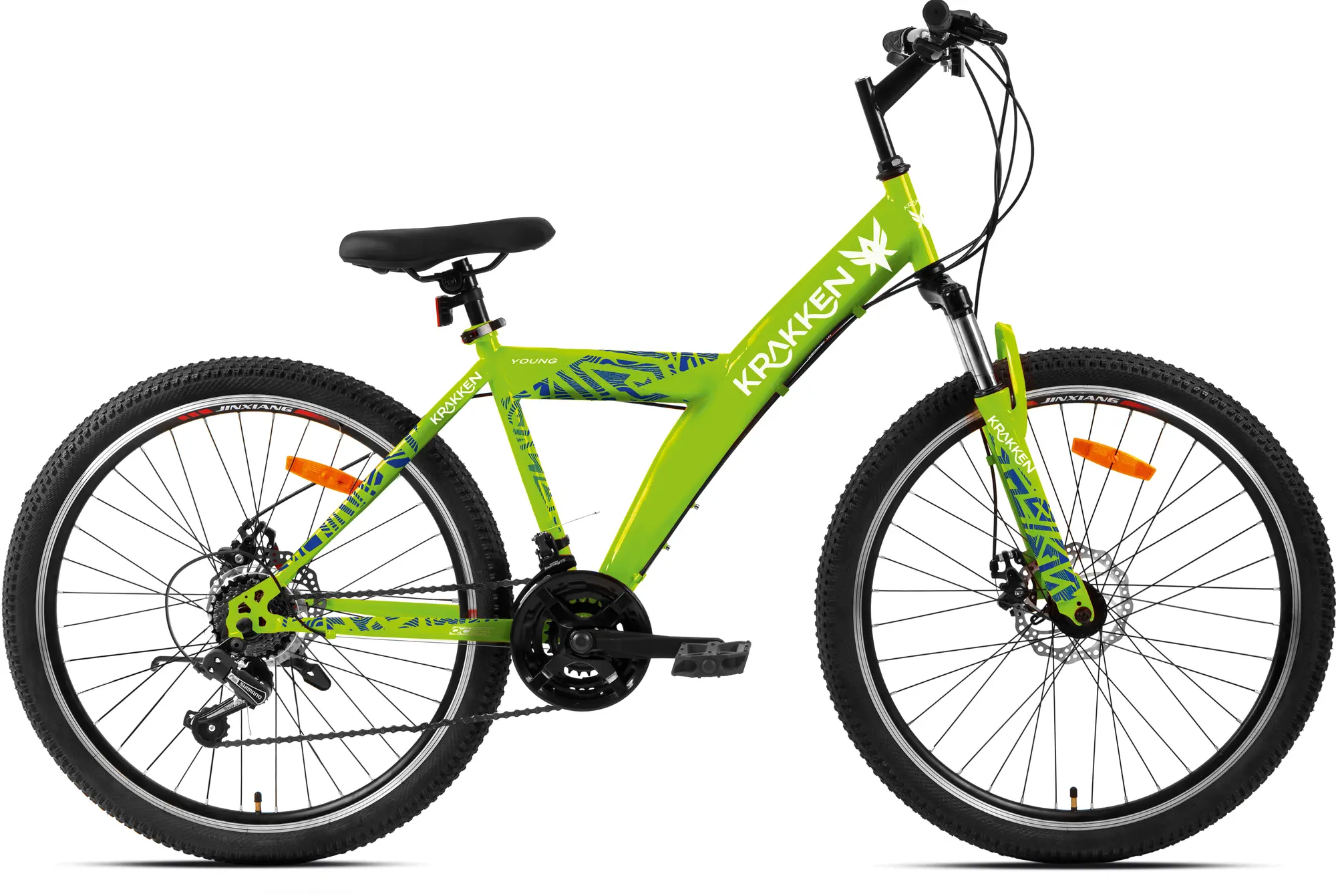 Krakken Young 26 предлагает расширенный диапазон передач для комфортного преодоления различных типов рельефа. Амортизационная вилка с ходом 80 мм эффективно поглощает неровности дороги. 21-скоростная трансмиссия обеспечивает оптимальный подбор усилий при катании. Дисковые механические тормоза гарантируют надежное торможение в любых погодных условиях. Двойные алюминиевые обода повышают прочность колесной базы. Универсальные покрышки 2.125 дюйма обеспечивают уверенное сцепление на различных поверхностях. Прочная стальная рама рассчитана на активную эксплуатацию в условиях бездорожья.