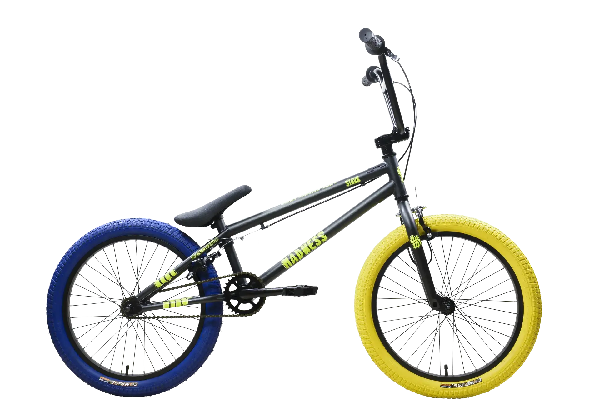 Stark Madness BMX 1 – профессиональный трюковой велосипед в агрессивном дизайне (графит матовый/жёлтый/синий), созданный для экстремального катания и выполнения трюков.