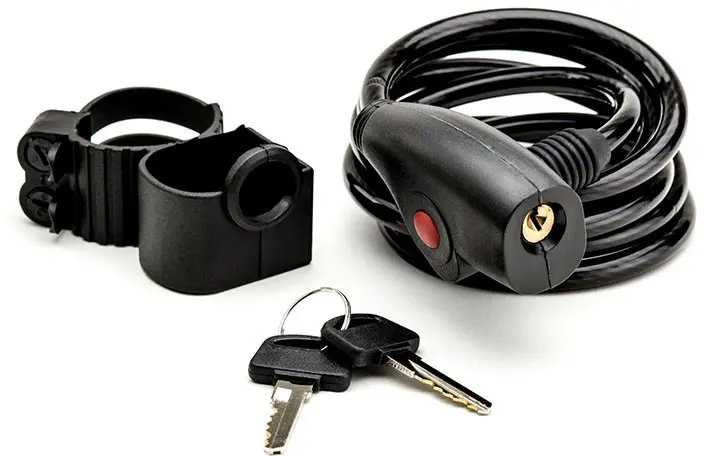 Стальной трос в пластиковой оплётке. Ключ плоский.